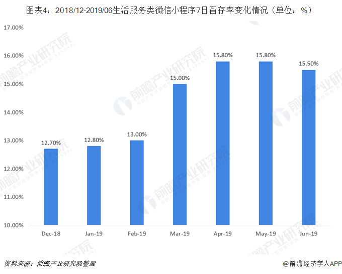 生活服务类小程序作为日常生活中的高频刚需,功能完善,操作便捷的生活服务类小程序正在被越来越多的人群所接受。生活服务类微信小程序由2018年12月份的月人均使用7.6小时增长至2019年6月份的月人均使用8小时,而用户7日留存率也逐渐升高,由2018年12月份的12.7%增长至2019年6月份的15.5%。
