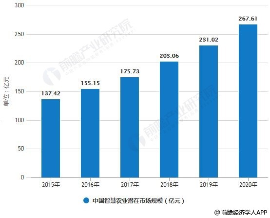 据前瞻产业研究院发布的《中国互联网+智慧农业趋势前瞻与产业链投资战略分析报告》统计数据显示,2015年中国智慧农业潜在市场规模已达137.42亿元,到了2017年中国智慧农业潜在市场规模增长至175.73亿元,截止至2018年中国智慧农业潜在市场规模突破200亿元,达到了203.06亿元。根据前瞻产业研究院预测,到2020年中国智慧农业潜在市场规模将达到267.61亿元,2015-2020年复合增长率达14.3%。