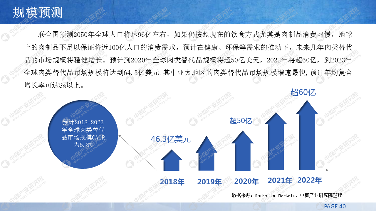 联合国预测2050年全球人口将达96亿左右,如果仍按照现在的饮食方式尤其是肉制品消费习惯,地球上的肉制品不足以保证将近100亿人口的消费需求。预计在健康、环保等需求的推动下,未来几年肉类替代品的市场规模将稳健增长。预计到2020年全球肉类替代品规模将超50亿美元,2022年将超60亿,到2023年全球肉类替代品市场规模将达到64.3亿美元;其中亚太地区的肉类替代品市场规模增速最快,预计年均复合增长率可达8%以上。