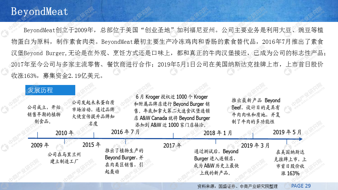 BeyondMeat创立于2009年,总部位于美国“创业圣地”加利福尼亚州。公司主要业务是利用大豆、豌豆等植物蛋白为原料,制作素食肉类。公司以植物蛋白为原料制作素食肉类,主要提供四种“人造肉”,口感和味道均贴近真正的肉类,且不含大豆、麸质和转基因食品,饱和脂肪含量明显低于动物脂肪。