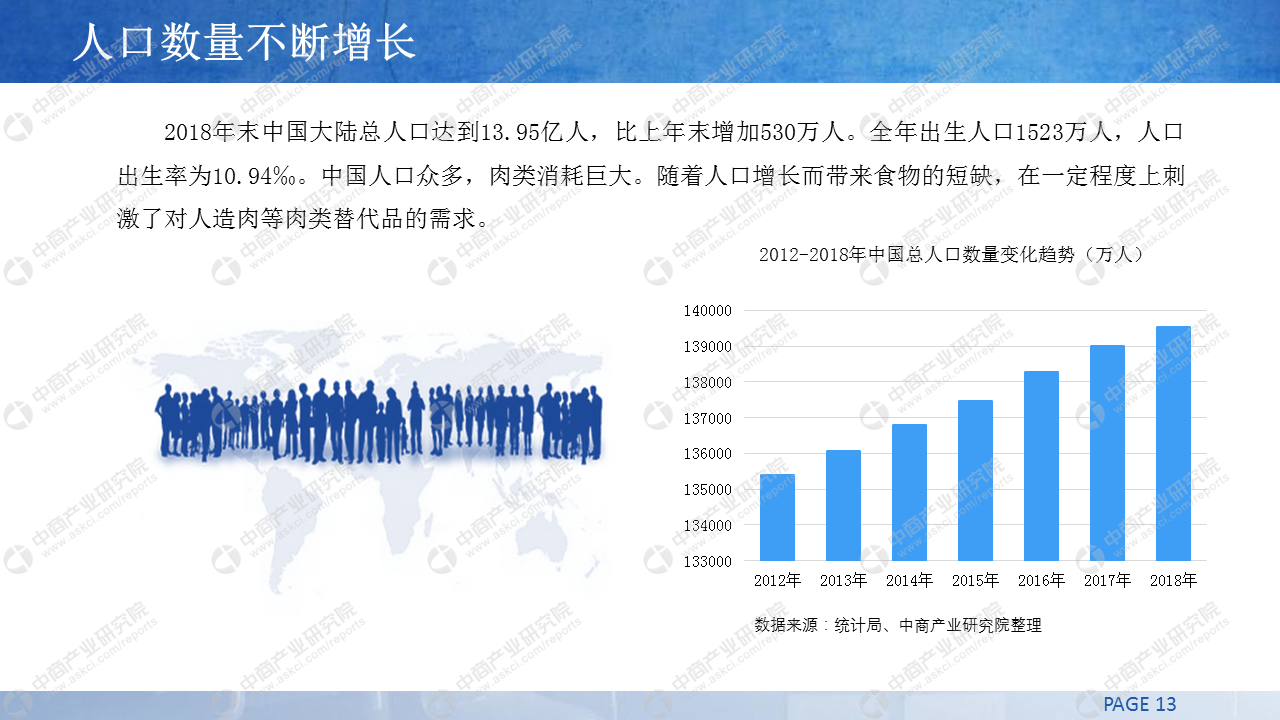 2018年末中国大陆总人口达到13.95亿人,比上年末增加530万人。全年出生人口1523万人,人口出生率为10.94‰。中国人口众多,肉类消耗巨大。随着人口增长而带来食物的短缺,在一定程度上刺激了对人造肉等肉类替代品的需求。