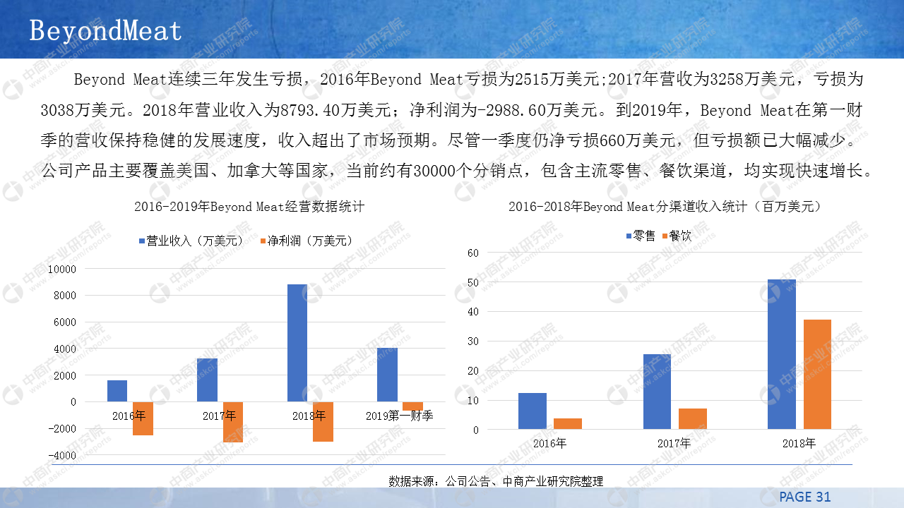 BeyondMeat连续三年发生亏损,2016年BeyondMeat亏损为2515万美元;2017年营收为3258万美元,亏损为3038万美元。2018年营业收入为8793.40万美元;净利润为-2988.60万美元。到2019年,BeyondMeat在第一财季的营收保持稳健的发展速度,收入超出了市场预期。尽管一季度仍净亏损660万美元,但亏损额已大幅减少。