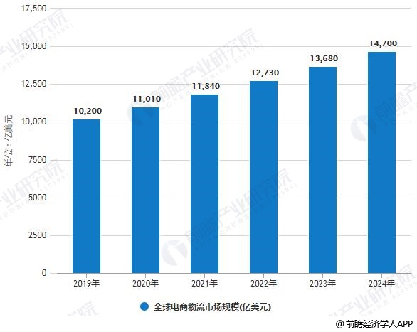 根据目前的全球电商物流的发展趋势来看,未来一段时间全球的电子商务将会出现结构性增长,东南亚、非洲等地方发展潜力巨大。根据前瞻产业研究院发布的《中国电商物流行业发展模式与投资战略规划分析报告》统计数据显示,2019年全球电商物流市场规模将突破万亿美元,达到10200亿美元,并预测在2024年全球电商物流市场规模将增长至14700亿美元左右。