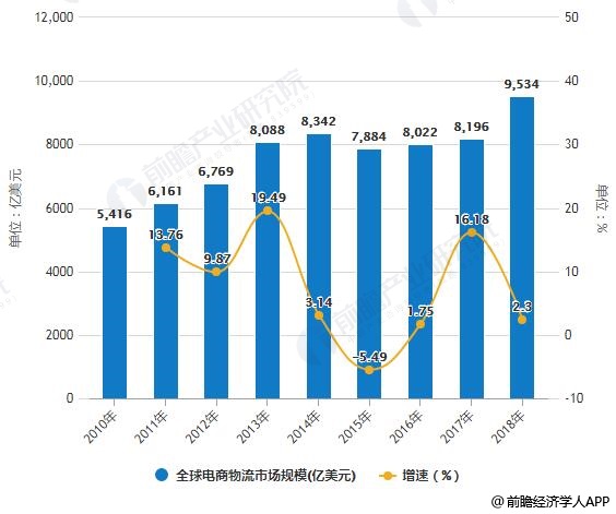 根据投资和市场分析领域的领先者Al Masah Capital最近的一份报告,全球电商物流市场规模从2010年的5416亿美元扩大至2018年的9534亿美元。近9年增长近1倍。