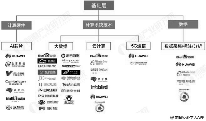 1)以AI芯片和软件为框架的基础层;基础层是人工智能产业的基础,主要是研发硬件及软件,如AI芯片、数据资源、云计算平台等,为人工智能提供数据及算力支撑。主要包括计算硬件(AI芯片)、计算系统技术(大数据、云计算和5G通信)和数据(数据采集、标注和分析)。