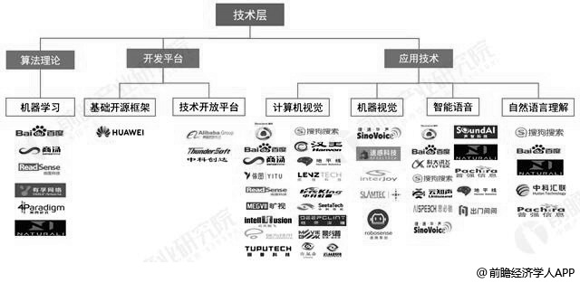 2)以语音识别、计算机视觉、自然语言交互为主的技术层;技术层是人工智能产业的核心,以模拟人的智能相关特征为出发点,构建技术路径。主要包括算法理论(机器学习)、开发平台(基础开源框架、技术开放平台)和应用技术(计算机视觉、机器视觉、智能语音、自然语言理解)。