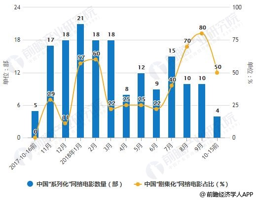 2017-2018年10月中国“系列化”网络电影数量及“剧集化”网络电影占比统计情况