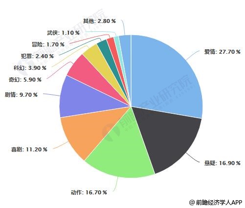 从上线新片的类型来看,爱情片上新数量位居第一,占比为27.7%;悬疑、动作、喜剧和剧情类网络电影也跻身前五。前五大类网络电影上新数量合计占比高达82.1%。