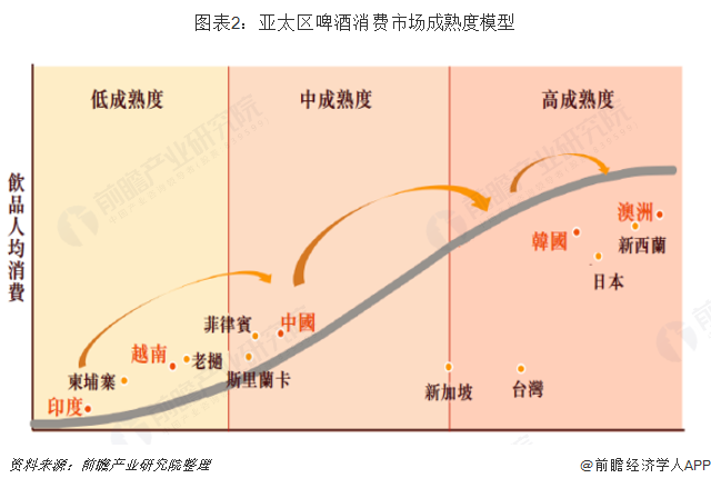 据百威英博(亚太)最新招股说明书显示,在依照亚太地区各国家经济发展程度、对酒类的限制及人均酒精消费量等因素制定的啤酒市场成熟度模型中,中国位于中档偏低水平,距离啤酒消费发展成熟的市场和国家仍然有明显的差距。