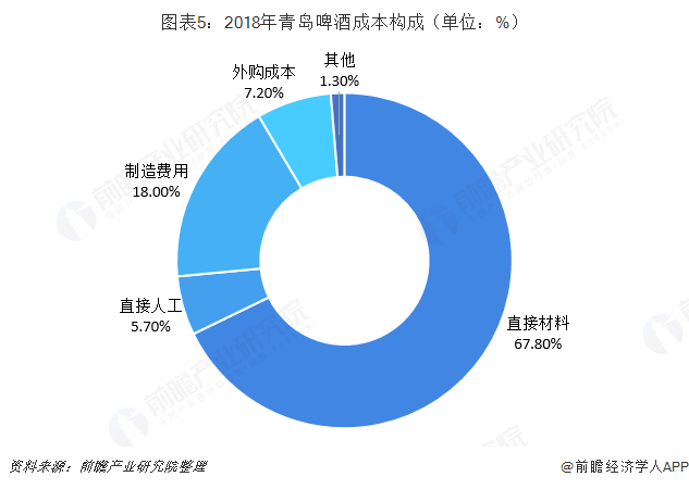 啤酒生产的主要成本包括酿酒原材料(大麦麦芽、酵母、水)、包装材料(铝罐、玻瓶、纸箱)、直接人工及制造费用。其中,原料(包括酿酒原材料及包装材料)是啤酒生产的最主要成本。以青岛啤酒为例,直接材料在成本中占比达到67.8%。