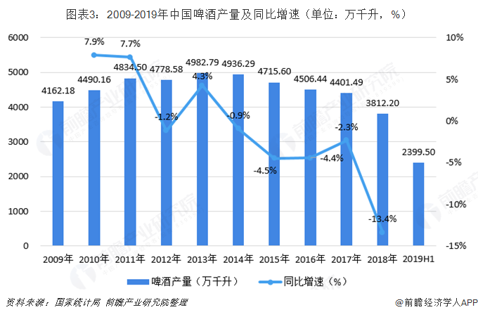 根据国家统计局数据,2009-2018年,中国啤酒产量总体上呈先上升后下降的趋势。中国啤酒产量在2013年达到顶峰,当年产量为4982.79万千升,同比增长4.3%。随后中国啤酒产量逐年下降,2018年中国啤酒产量下降至3812.20万千升。