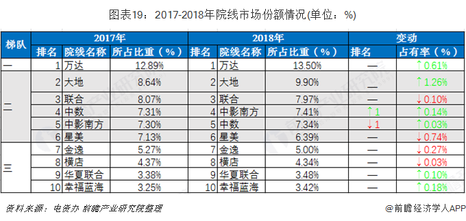 我国电影院线分成三个梯队,万达院线一枝独秀,占市场份额的13%左右,2-6名差别不大,在6%~10%之间,7-10名差别也不大,在3%~5%之间。