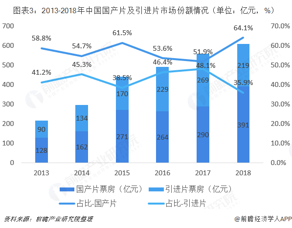 但2018年,国产影片综合票房达391亿元,票房占比达64.1%,较上年提升12pct,《战狼2》以来国产电影创作周期仍处于触底回升大周期中。国产影片已成为中国电影市场的主要票房来源。