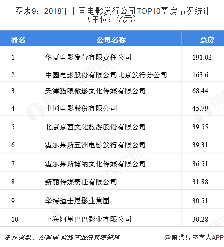 而进入2019年以后,截至5月9日,华夏电影发行有限责任公司的票房收入为124.92亿元,仍然排名第一;霍尔果斯五洲电影发行有限公司、霍尔果斯博纳文化传媒有限公司、新丽传媒责任有限公司、上海阿里巴巴影业有限公司四家公司跌出前十;而霍尔果斯青春光线影业有限公司、上海博纳文化传媒有限公司、耳东时代影业(天津)有限公司、乐创影业(天津)有限公司四家公司则跃进前十。