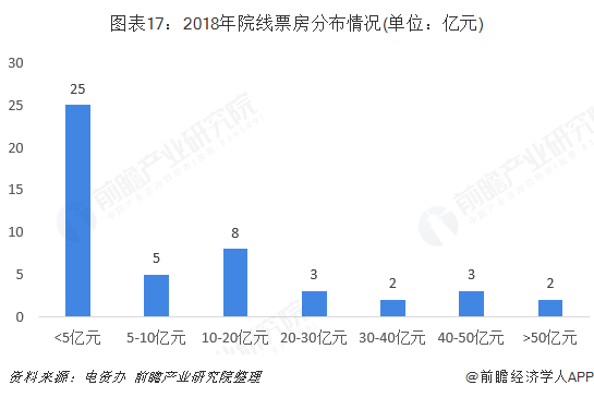从2018年票房情况来看,电资办统计的48条院线中,有多达25条票房在5亿元以下,票房在5-20亿元的院线数量次之,为13条,2条院线营收在50亿元以上,分别是票房达81.92亿元的万达院线和60.06亿元的大地院线,院线行业强者恒强的马条效应越发明显。