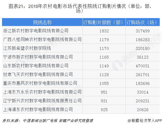 从市场竞争角度来看,由于市场水平不高,市场竞争主体少,农村电影市场竞争水平低,主要受到政府政策影响较大。同时,随着农村电影市场的逐渐发展,也出现了多个地方性的农村电影院线。从订购场次来看,全年农村地区订购情况总体相对平稳,受湖湘经典戏曲电影展映月活动影响,湖南省订购量增幅较大,同比涨幅37.10%;从院线情况看,订购前十的院线中前四名院线格局未变,其他均有上下浮动的调整。2018年,山东新农村、江西欣荣农村院线处于第一阵营,订购场次超过40万;江苏新希望农村、浙江新农村院线处于第二阵营,订购场次超过30万;甘肃飞天农村、辽宁新兴农村院线处于第三阵营,订购场次超过20万。