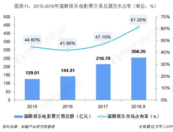 猫眼娱乐是国内提供互联网娱乐服务平台,其主要服务包括娱乐票务、娱乐内容服务、娱乐电商、广告服务等。2019年2月4日,猫眼娱乐在香港交易所正式开盘,市值为160亿港元。根据其招股说明书提供数据,2018年1-9月,猫眼娱乐电影票交易总额达到256.25亿元,在“在线电影票务”领域拥有61.3%的市场占有率,处于在线电影票务市场领先地位。