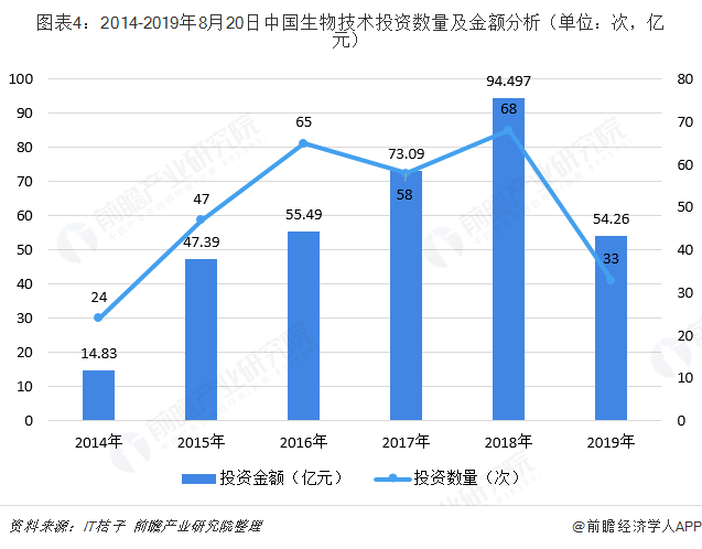 根据IT桔子对我国生物技术的投资情况统计来看,2014-2018年,国内生物技术的投资数量和金额呈波动增长态势。2018年国内生物技术投资数量为68次,总投资额为94.497亿元,相较于2017年有所提高。