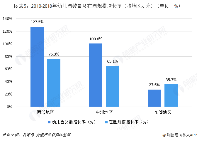 从区域看,西部地区学前教育发展最快,从2010年到2018年,西部地区幼儿园总数增加了127.5%,在园规模增加了76.3%,中部地区分别是100.6%和65.1%,东部地区分别是27.6%和35.7%。从2010年到2018年,学前三年毛入园率增长幅度最大的15个省份都在中西部,东中西部学前教育发展差距明显缩小。