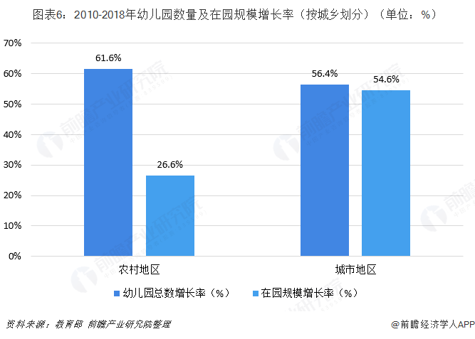 从城乡看,幼儿园数量农村增幅最大,在园规模城市增幅最大,从2010年到2018年,农村地区幼儿园总数增加了61.6%,在园规模增加了26.6%,城市地区分别增加了56.4%和54.6%。在新增资源总量中,农村幼儿园占69.8%、在园幼儿占49.2%,农村学前教育资源得到较快增长。