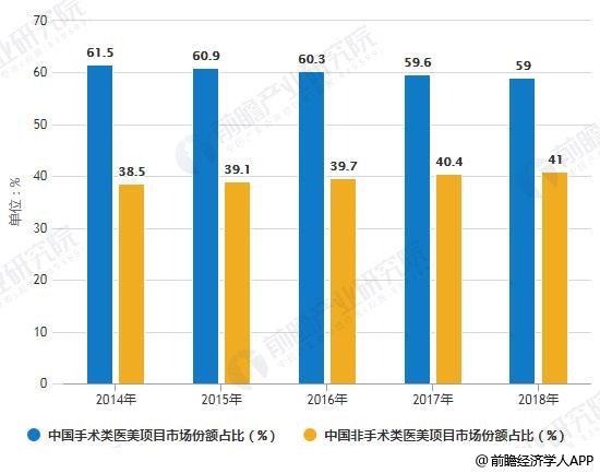 从细分领域来看,目前手术类医美项目市场份额仍居主导地位,但由于非手术类项目的风险相对较低、起始花费也较低,近年来日渐收到爱美人士的追捧。2018年,非手术类医美项目市场份额占比为41%,较2014年提高了2.5个百分点。