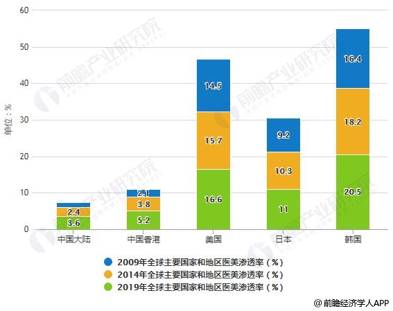 2009-2019年全球主要国家和地区医美渗透率对比情况