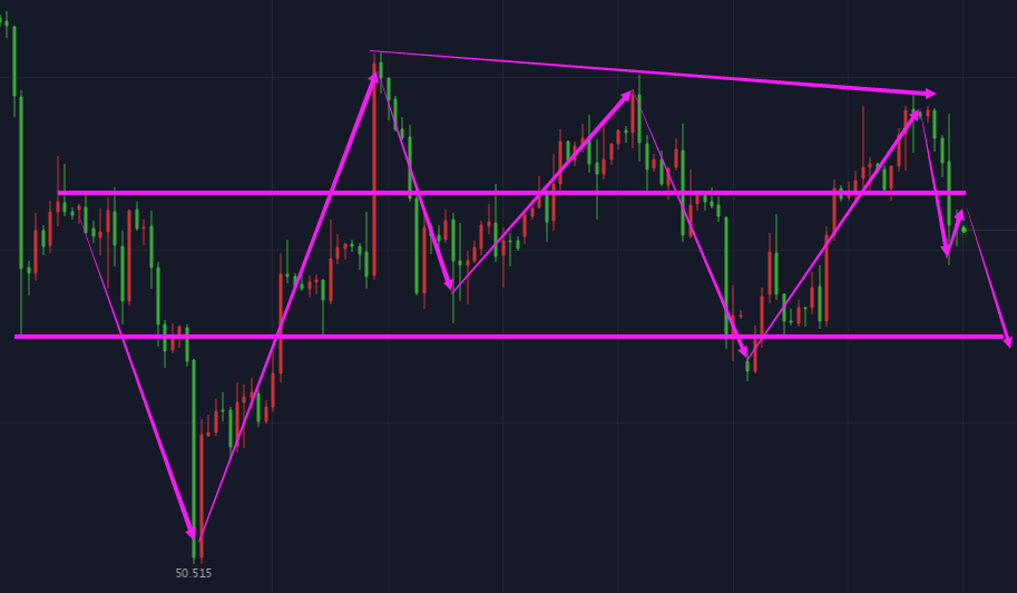 4、从四小时图来看,只看近期的走势,是一个三重顶的形态,上方57关口强压,其次为56.5-56.7区域,下方支撑54.5一线、53.7附近低点支撑,以及53整数关口。