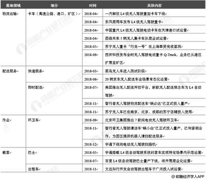 2018年,我国自动驾驶主要在物流运输、配送服务、作业、载客四大领域实现落地。
