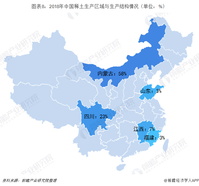 我国作为世界性稀土大国,以37%的储量供应着全球70%的产量。主要稀土资源分布在内蒙古、江西、广西、四川、山东等地区,形成北、南、东、西的分布格局,并具有北轻南重的分布特点。轻稀土主要分布在内蒙古包头的白云鄂博矿区,其稀土储量占全国稀土总储量的83%以上,居世界第一,2018年其稀土产量占比达到全国的58%,是我国轻稀土主要生产基地。离子型中重稀土则主要分布在江西赣州、福建龙岩等南方地区,尤其是在南岭地区分布可观的离子吸附型中稀土、重稀土矿,易采、易提取,已成为我国重要的中、重稀土生产基地。