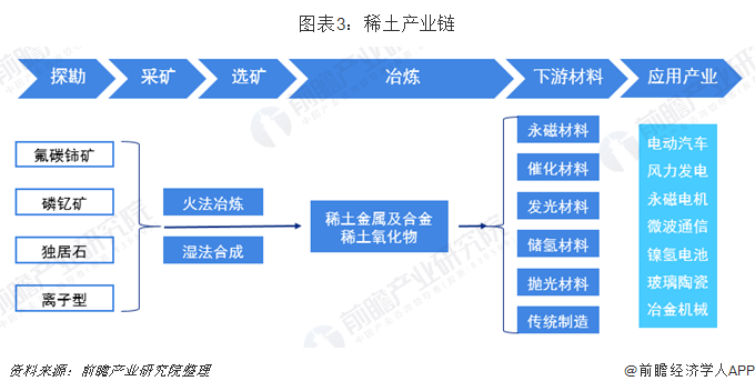 稀土从资源开发到应用主要分为探勘、采矿、选矿、冶炼等六个步骤。首先从稀土原矿中通过选矿得到稀土精矿,再通过湿法或者火法冶金分别得到稀土化合物与稀土合金。对于稀土化合物与稀土金属,又可进一步分离成永磁材料、催化材料、发光材料等多种下游材料,最后被广泛引用进电动汽车、风力发电、永磁电机、微波通信等多个应用产业。