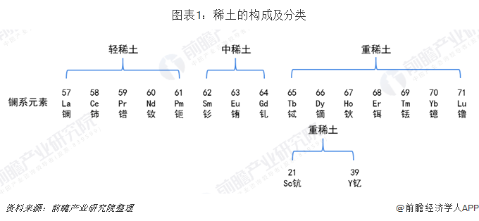 稀土是一组典型的金属元素,有着“工业维生素”的美称。简单来说,稀土元素是指元素周期表中原子序数为57到71的15种镧系元素氧化物,以及与镧系元素化学性质相似的钪(Sc)和钇(Y)共17种元素的氧化物。根据稀土元素原子电子层结构和物理化学性质,以及它们在矿物中共生情况和不同的离子半径可产生不同性质的特征,十七种稀土元素通常分为轻稀土和中、重稀土。