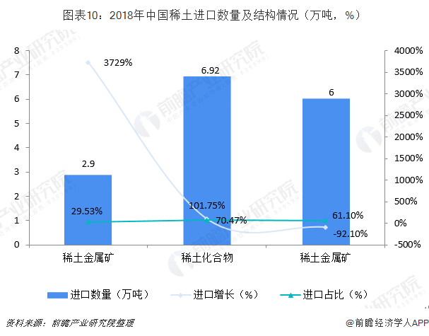 在进口方面,随着中国产业结构调整,中国开始增加稀土进口比例。2018年,中国稀土进口量大幅增长,进口稀土产品总量约9.82万吨,同比增长179%,一跃成为世界最大的稀土进口国。其中,稀土金属矿2.9万吨,同比+3729%;稀土化合物6.92万吨,同比+101.75%;稀土金属6吨,同比-92.1%。主要进口国家为美国、缅甸、马来西亚、法国和日本,合计占总进口量的99.51%。
