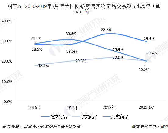 根据国家统计局数据显示,2018年我国实物商品网上零售额为7.02万亿元,同比增长25.4%。其中吃类商品同比增长33.8%,较2017年提升5.2个百分点,穿类商品增长22.0%,较2017年提升1.7个百分点;用类商品增长25.9%,较2017年下降4.9个百分点。最新数据显示,2019年1-7月份,在实物商品网上零售额中,吃、穿和用类商品分别增长29.9%、20.4%和20.2%,吃类产品在网上零售增速仍然占据第一位。