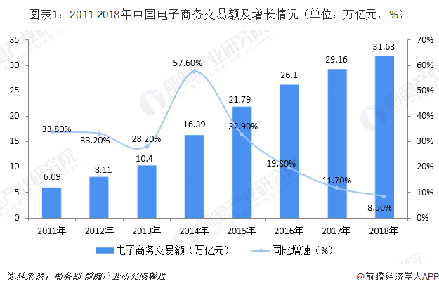 近年来,我国电子商务交易规模不断扩大,稳居全球网络零售市场首位,随着大型电商平台开拓跨境电商业务,我国电商市场与全球电子商务市场的联动态势愈加明显。根据商务部数据显示,2018年全国电子商务交易额达到31.63万亿元,同比增长8.5%,其中商品、服务类电子商务交易额达到30.61万亿元,同比增长14.5%。