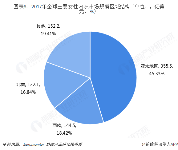 从区域市场来看,亚太地区是全球女性内衣第一大市场,2017年市场规模占比高达45.33%;此外,西欧、北美的市占率也在15%以上;而拉美、中东、欧洲、非洲等市场市场份额相对较小。