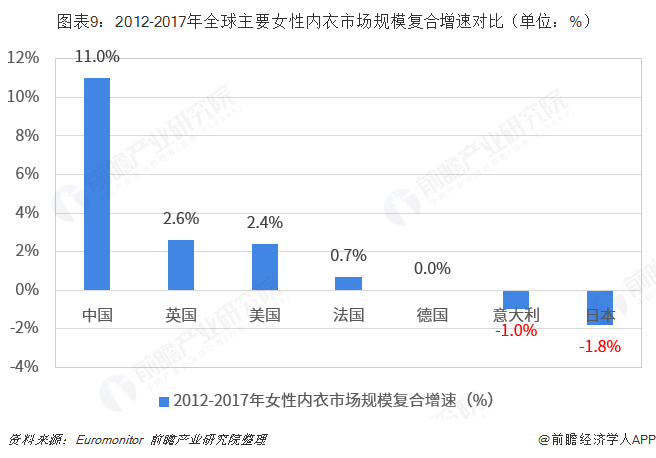 1、在区域市场布局上,要重视在中国市场。从女士内衣规模增速来看,2012-2017年,中国女性内衣的市场规模复合增速明显高于美国、英国、意大利、德国、法国、日本等国家,其中,中国的增速为11%,远高于第二梯队的英国和美国;而意大利和日本等国家女性内衣行业规模复合增速更是出现了下滑。可见,中国内衣市场增长潜力强劲,未来发展前景值得期待。