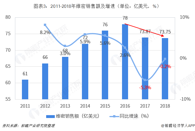 在销售业绩方面,2011-2018年,维密销售额增速总体也呈下滑趋势,并在2017年首次出现了负增长。2018年,维密销售额继续延续下滑趋势,较上年下跌了0.2%,仅为73.75亿美元。外界预计,短期内维密业绩增长难有大幅起色。