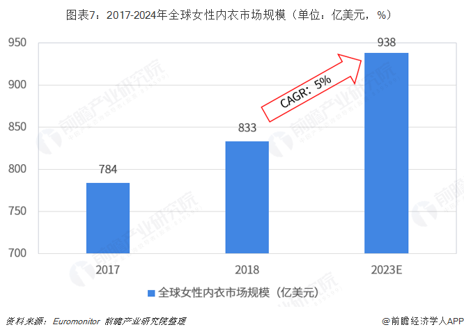 而尽管Victoria's Secret销售表现不佳,但这并不能代表全球女性内衣行业的发展现状。事实上,女性内衣市场一直被称为“服装界的最后一块蛋糕”,未来全球女性内衣市场仍具有巨大的发展空间。根据Euromonitor数据,2018年,包括塑身内衣在内的全球女性内衣市场规模在833亿美元左右,较2017年增长了6.25%;同时,Euromonitor预计2018-2023年全球女性内衣规模年均复合增速将在5%左右,到2023年市场规模有望达到940亿美元左右。