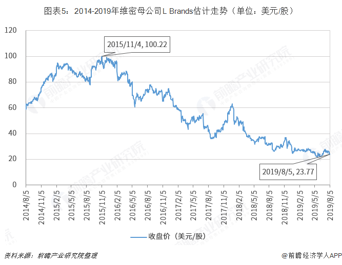 另一方面,在股价上,2014年至今,L Brands的股价总体不断下跌。截至2019年8月5日,维密母公司的收盘价为23.77美元/股,相较于2015年11月4日的100.22美元/股跌去了76.28%。