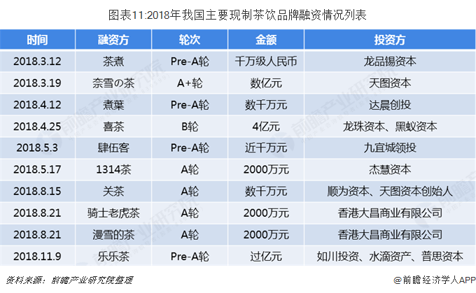 2018年是我国现制茶饮市场“疯狂”的一年,在一二级市场资金紧张背景下,据不完全统计,该细分行业仅几家明星品牌全年融资就超过10亿元。其中,奈雪の茶更以A+轮60亿估值成为我国现制茶饮行业第一个独角兽企业,喜茶单轮融资金额达到4亿元,众多成立于2014-2016年的现制茶饮品牌在2018年迎来了集中融资风潮,且融资金额均在1000万元以上。