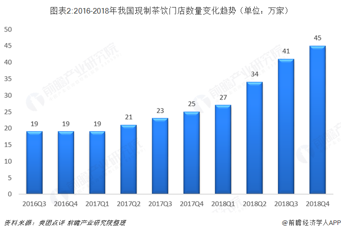 根据美团点评数据显示,截至2018年第三季度末,我国现制茶饮门店数量达到41万家,一年内增长了74%,扩张速度非常快,前瞻结合目前的市场发展趋势,预计到2018年底,我国现制茶饮门店数量将达到45万家。而新增长主要来自消费者对常规饮料的替代和消费群体对“健康茶饮”的需求,中国奶茶市场在经历了粉末时代、街头时代后,已经迎来新式现制茶饮时代。