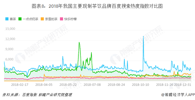 喜茶作为强品牌+强运营的代表,成为国内经久不衰的网红茶饮品牌。打造“强品牌”方面,目前喜茶虽然存在着黄牛排队等质疑,但是根据草根调研,其火爆程度毋庸置疑。这也可以从2018年我国主要现制茶饮品牌的百度指数搜索热度走势可以看出:2018年6月之前,喜茶和一点点奶茶热度互有高低,但6月之后,喜茶始终保持较高热度,而一点点奶茶则出现了明显下滑。并且2018年间喜茶始终保持在高位,显著高于其他竞争对手。