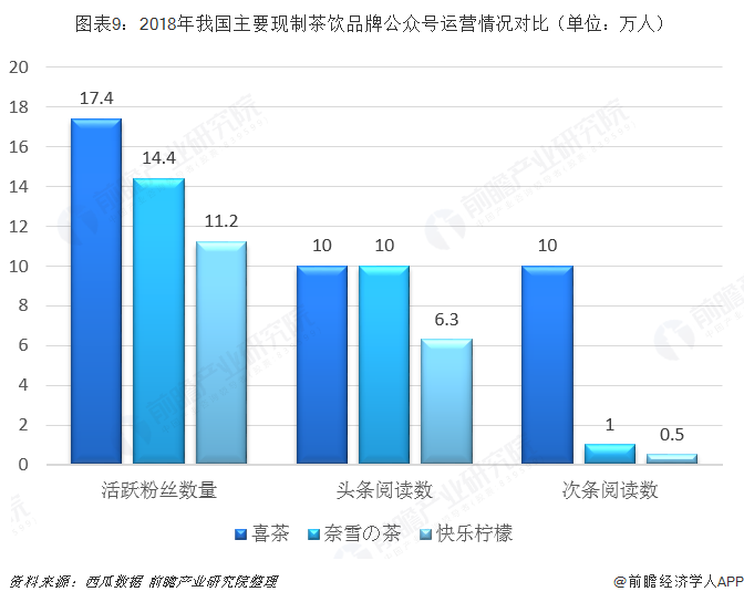 “强运营”方面,根据西瓜数据的监测,喜茶公众号2018年的活跃粉丝数量高达17.4万人,远远高于同时期的奈雪の茶与快乐柠檬。从文章阅读数量来看,喜茶更是佼佼者,大幅领先于其他奶茶品牌。这些都从各个角度证明了喜茶的粉丝数量和其活跃程度,彰显了喜茶品牌运营的成功。