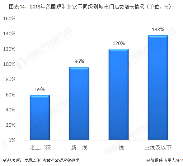 伴随着消费升级的逐步下沉,我国现制茶饮业未来在二、三线城市将拥有巨大的市场发展空间,这一市场趋势可以从美团点评2018年12月发布的数据看出,2018年,我国二线城市现制茶饮门店数较2016年同期增长120%,三级及以下城市的门店数增幅高达138%。