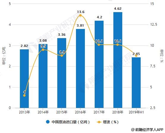 我国具有富煤、缺油、少气的资源禀赋特点,能源结构主要以煤炭为主,原油和天然气资源的对外依存度较高,2018年原油对外依存度达70%,天然气对外依存度达43%。根据中国海关总署(GAC)的数据,今年上半年,中国原油进口量同比大幅上升了8.8%,至2.446亿吨。