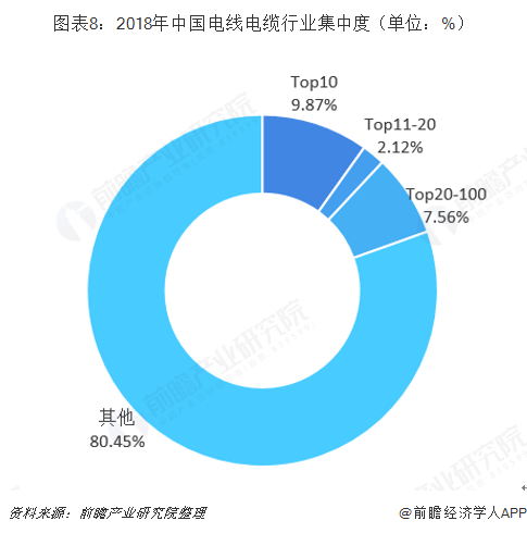 我国电线电缆行业正处于成熟期,产品同质性严重,多以中低端为主,竞争异常激烈。头部企业没有明显的技术优势,导致我国电线电缆行业集中度相对较低。2018年,我国电线电缆行业CR10不足10%,CR100约为20%。