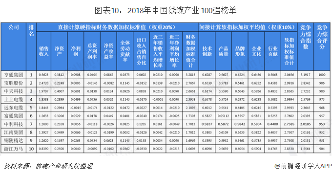 2018年9月,中国电器工业协会电线电缆分会和线缆信息研究院共同推出了“2018年中国线缆产业100强”榜单,从整体的竞争力表现来看,线缆行业整体竞争力表现比较平稳。优势企业的基础竞争力(直接计量硬指标财务数据)得分在相关子行业总排名的位次得到进一步巩固,亨通、宝胜、中天、上上、远东、富通等企业仍然保持领先。从2018年线缆各个企业的基础竞争力及各项得分来看,企业分化仍然十分明显。竞争力得分靠后的企业在相关子行业中的地位较上年进一步降低,呈现“强者恒强,弱者更弱”的态势。