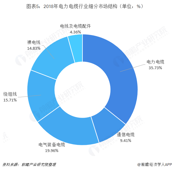 在我国电线电缆行业细分领域市场结构中,由于电力电缆的应用范围较广泛,该产品的收入规模占比较大,仍是行业重要的细分领域。随着节能环保发展理念的不断普及、我国电线电缆行业进入深化调整期,下游应用领域对电线电缆提出新的质量和应用需求,电气装备用电缆所占比重处于不断上升状态。2018年,我国电力电缆占全部市场比重为35.73%;电气装备用电缆占全部市场比重为19.96%,裸电线占全部市场比重约为14.83%。