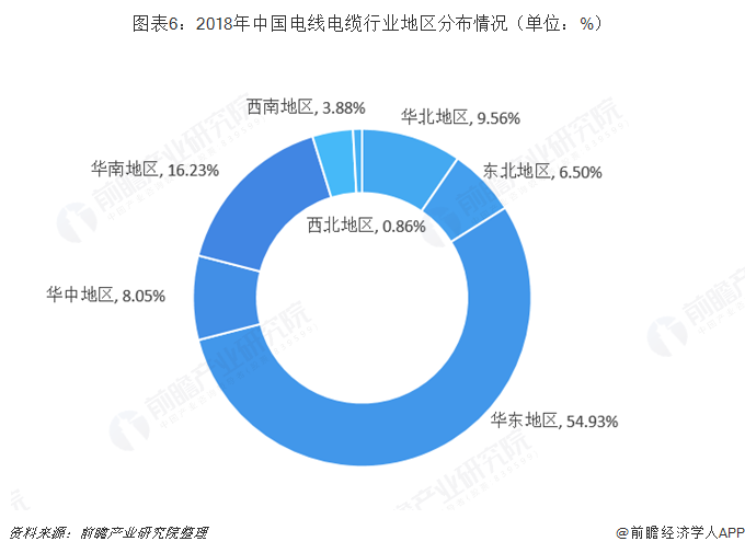 从地域分布上来看,2018年我国4049家规模以上企业主要分布在华东地区,企业数量为2224家,占全部企业的一半以上,我国电线电缆生产大省有两个位于华东地区,分别为江苏省800家和浙江省538家;华南地区位居第二,企业数量总计为657家,占全部企业数量的16.16%,主要电线电缆生产企业集中在广东省,企业数量为601家。西北地区企业数量最少,规模以上电线电缆生产企业仅有35家,占全部企业数量不足1%。主要原因为西北地区电线电缆需求较小,生产企业产品大多要外销到其他区域,额外的运输成本导致生产成本过高,随着近些年西北地区能源产业的逐渐发展,不断有大厂在西北地区投建分厂,西北地区电线电缆行业的发展前景比较乐观。