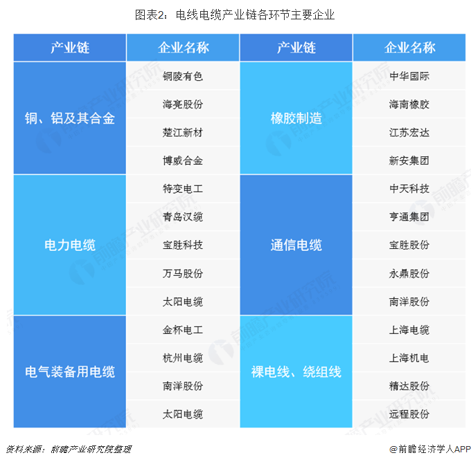 从企业来看,上游涉及到以铜、铝及其合金的金属材料企业为电线电缆产业提供主要组成材料,主要企业有铜陵有色、楚江新材、海亮股份等;橡胶及其制成品企业为电线电缆产业提供封装绝缘套,主要企业有中华国际、海南橡胶、江苏宏达等。在电线电缆行业中,可以分为以不同种类电线电缆为主营业务的电线电缆研发制造企业,制造电力电缆的主要企业有特变电工、青岛汉缆等;制造通信电缆的主要企业有中天科技、亨通集团等;制造电气装备用电缆的主要企业有金杯电工、杭州电缆等;制造裸电线、绕组线的主要企业有精达股份、远程股份等。